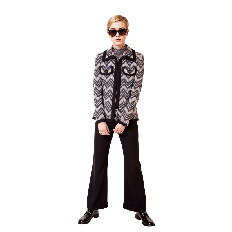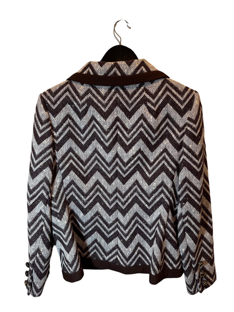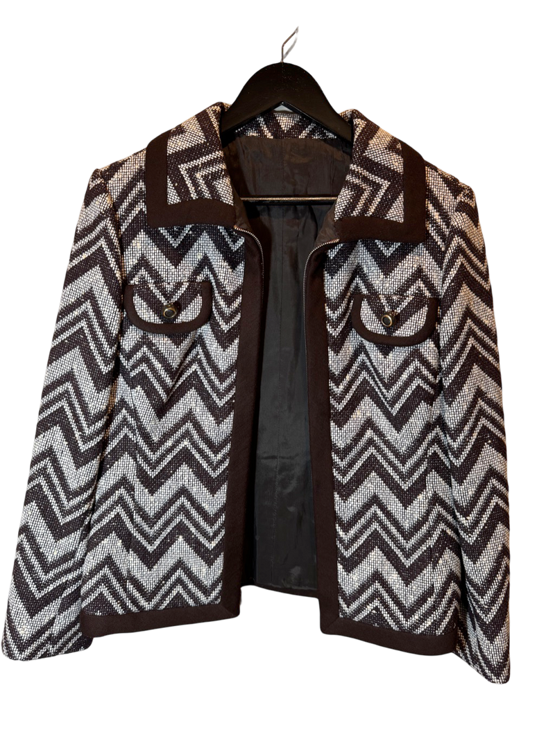 Palais Chevron Jacket – a 1970s black-and-white zigzag tweed blazer, made for dramatic entrances into mirrored elevators and fashion-forward hotel bars.
