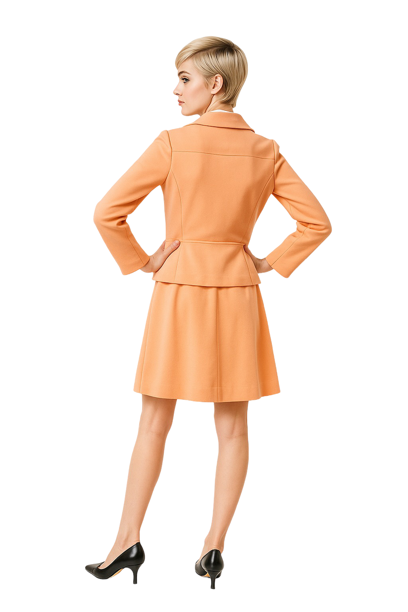 Finsbury Orange Suit Set – a sherbet-hued two-piece with razor-sharp tailoring and a swingy A-line skirt, styled with a printed collar-and-tie combo made for record shop hopping and department store daydreams.