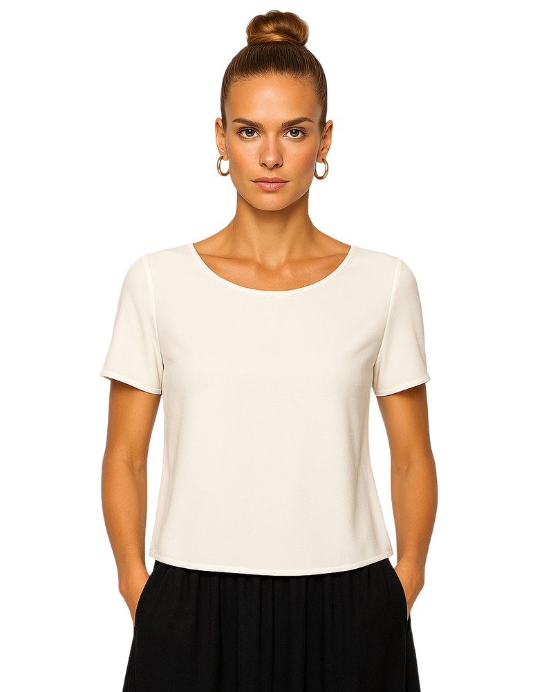 Éclair Studio Blouse – a luminous ivory top with soft drape and minimalist cut, designed for the flash of a camera or the hush of a backstage corridor. Its scoop neckline and tulip hem promise elegance with every step.