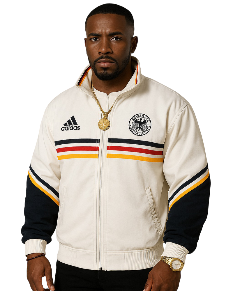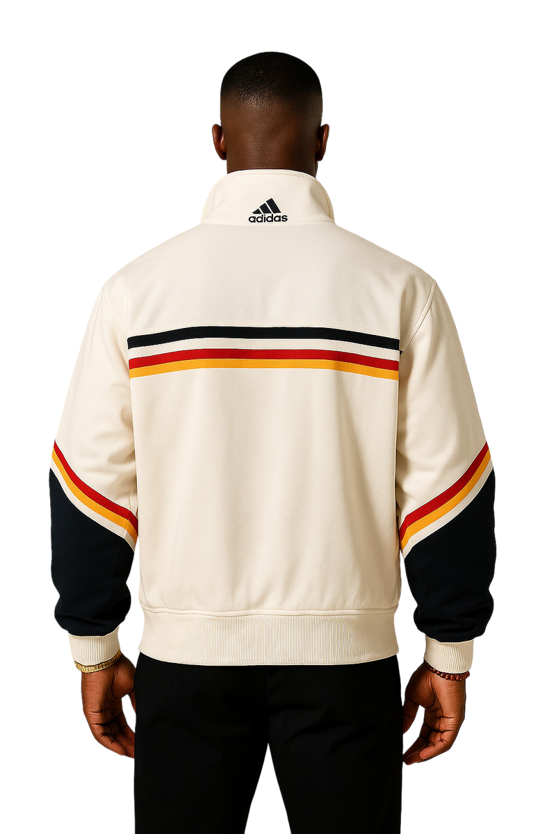Basement Anthem Track Jacket – a crisp white Adidas zip-up repping the bold tricolor of the Deutscher Fußball-Bund. With retro striping, a mock neck, and heavyweight swagger, it was made for block party cipher circles and low-end boom on boombox benches.