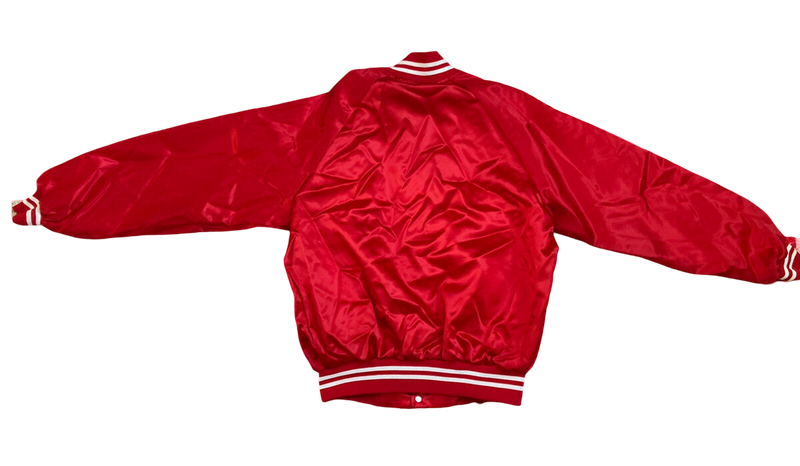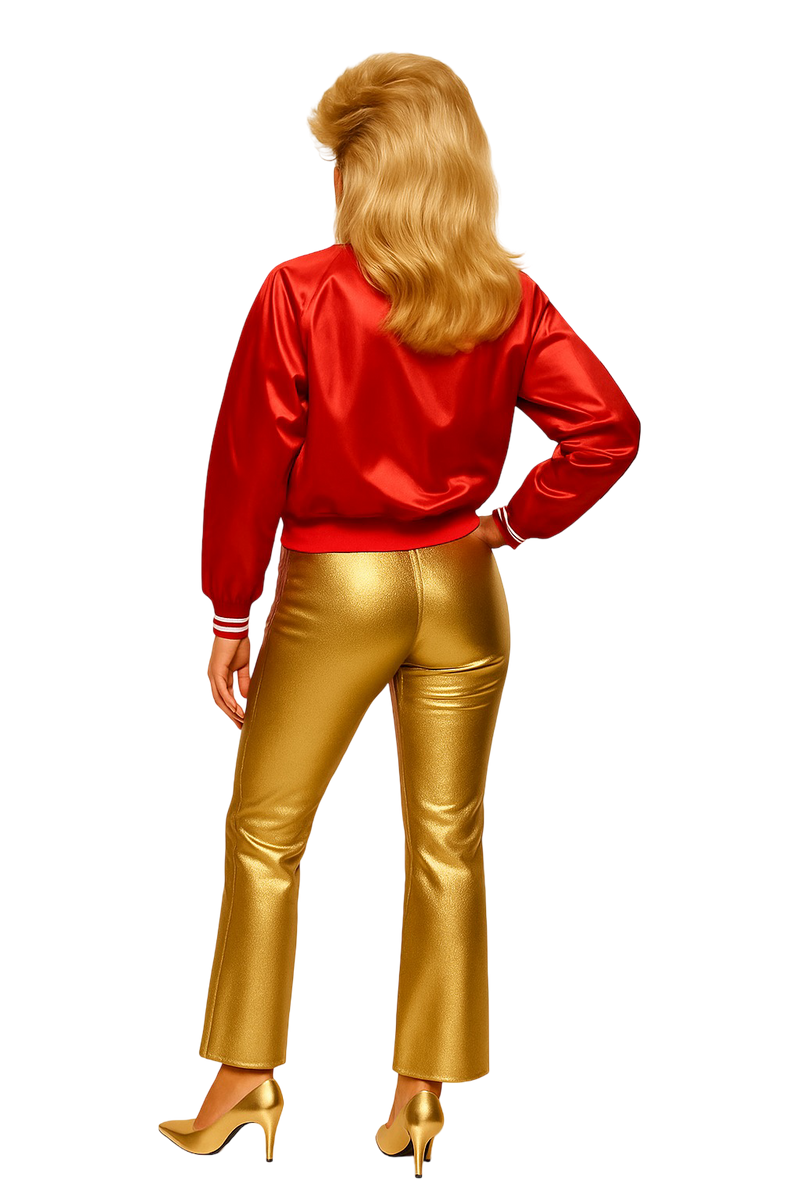 Roller Rink Ringleader Jacket – a high-gloss red satin snap-up with varsity striping and “Coach Forbes” embroidery. Equal parts locker room legend and discotheque daredevil, this one shines under fluorescents and strobe lights alike.