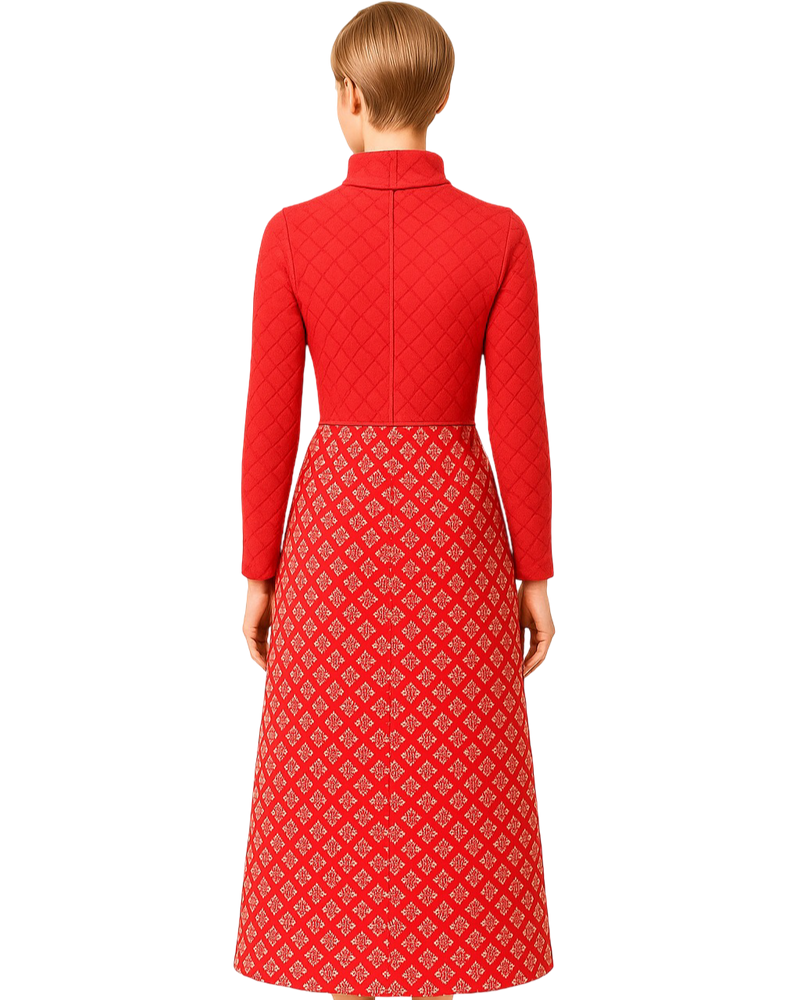 Piccadilly Red Knit Dress – a quilted turtleneck bodice meets a bold printed skirt and matching sash belt, striking that signature 1960s balance between tailored mod and playful rebellion. Perfect for gallery hops, Carnaby Street strolls, or dinner dates on the King’s Road.