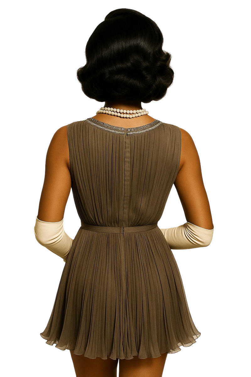 Paramount Chiffon Jewel Dress – a smoky gray, pleated chiffon mini with a sheer overlay and a showstopping Art Deco bib neckline, drenched in rhinestones and pearls. The silhouette floats, but the neckline stuns—pure silver screen drama.