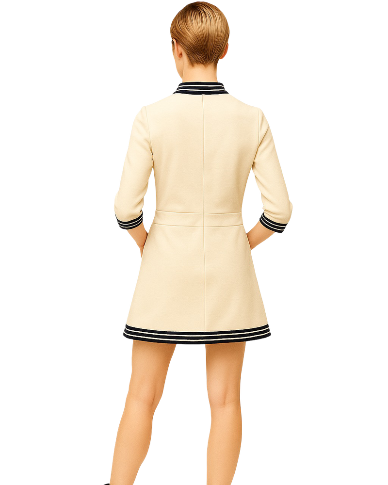 Pop Knit Dress – a crisp cream mini with black contrast buttons and varsity trim, echoing Carnaby Street sass and swinging London energy.