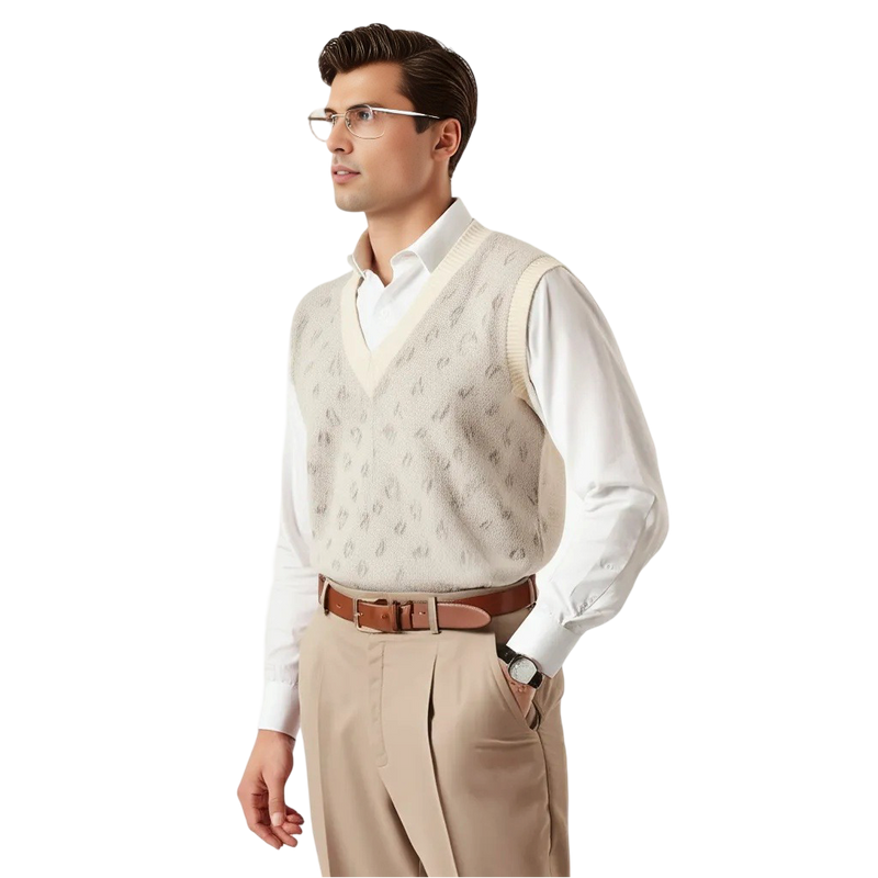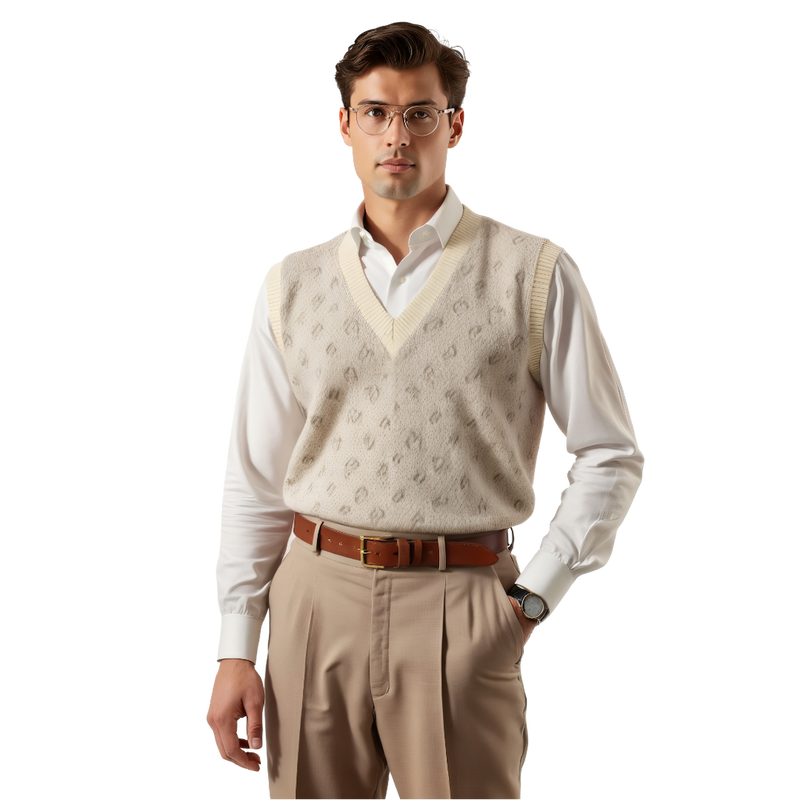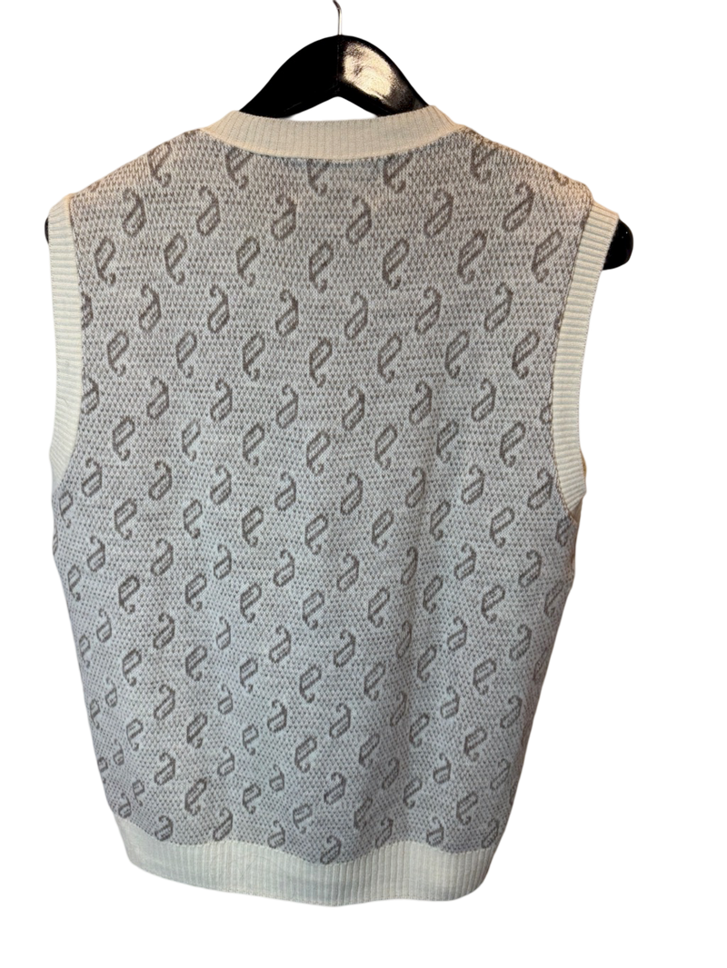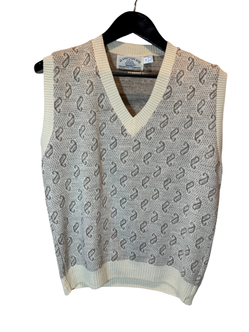 1960s Equestrian Knit Vest – a refined knit sweater vest featuring a subtle paisley pattern, embodying the quiet luxury of country club afternoons and elite sporting events.