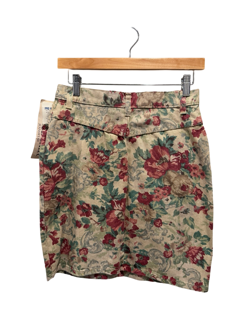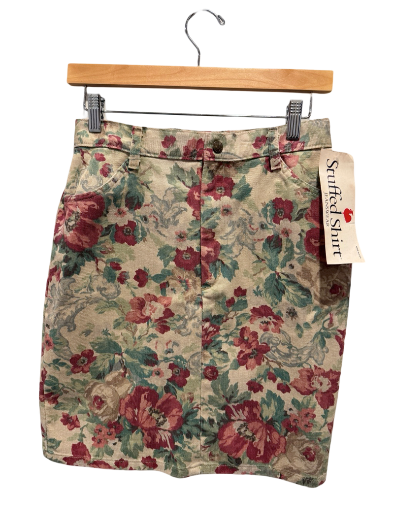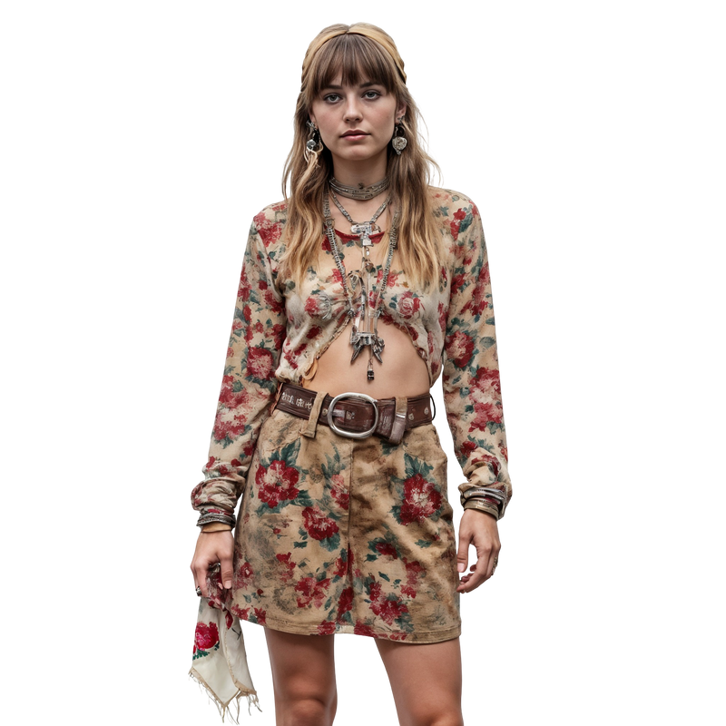 Flower Power Mini – 1970s high-rise denim mini skirt with tapestry-style florals, channeling the rebellious romance of paisley prints and protest poetry.