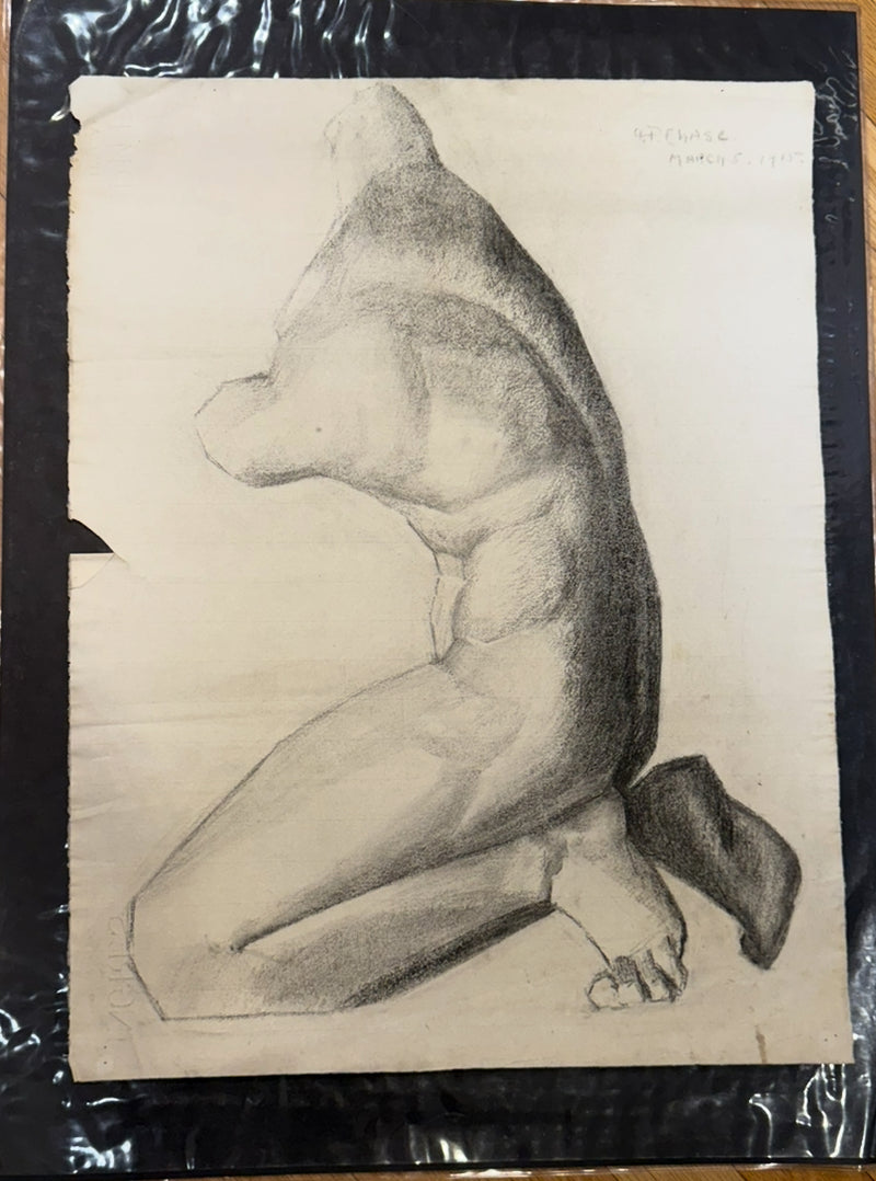 The sheet exhibits natural aging, including surface mottling, horizontal press lines, and a small notch along the upper left edge. This piece is sold unframed, preserving the raw atelier integrity of the early 20th-century academic tradition.