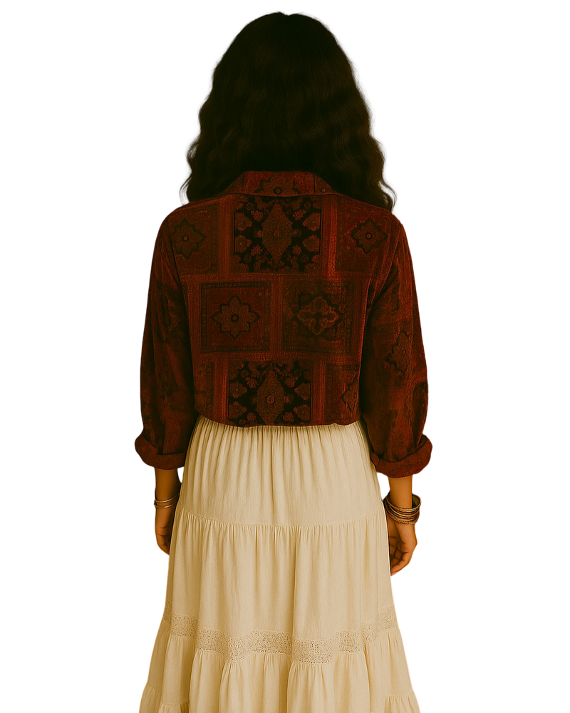 Marrakesh Tapestry Shirt – a lush velvet button-up patterned like a souk rug, dyed in oxblood, burnt umber, and black fig. Meant for slow mornings, incense trails, and rooftop music circles.