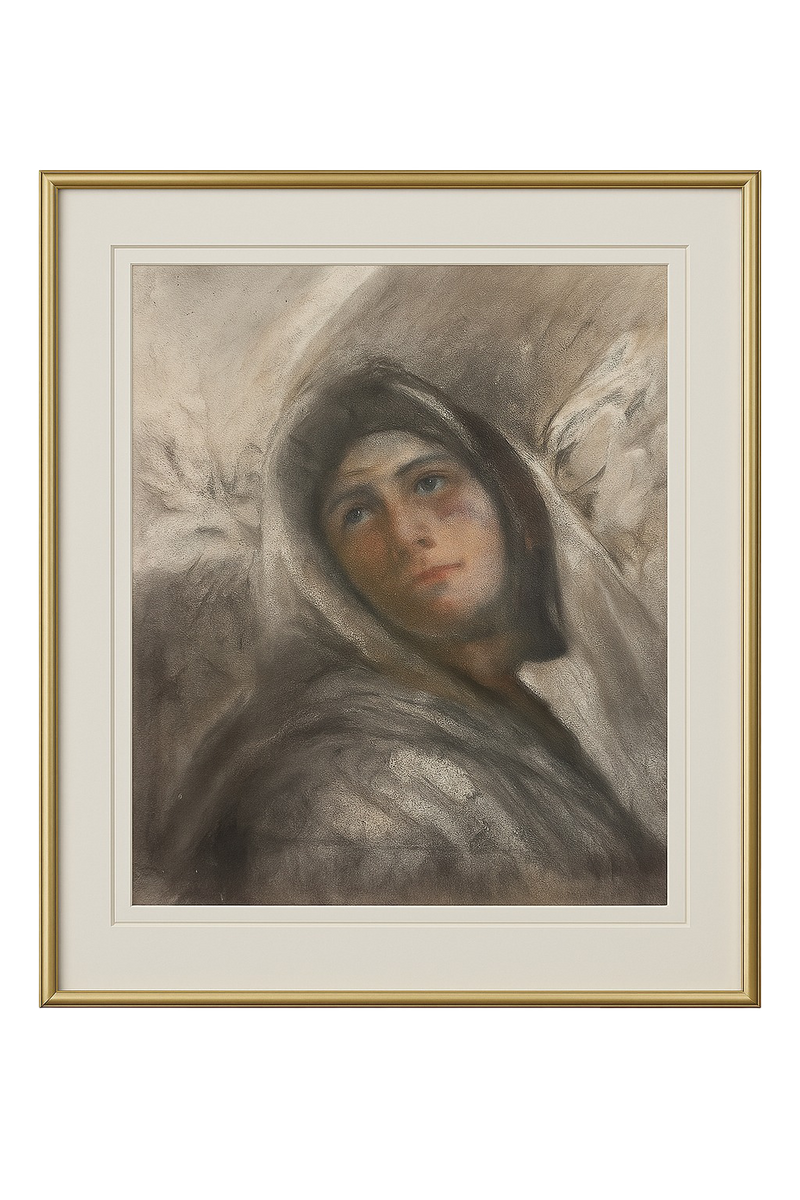 Executed in the academic realism tradition, this intimate half-length portrait captures a veiled woman cast in soft, radiant light.