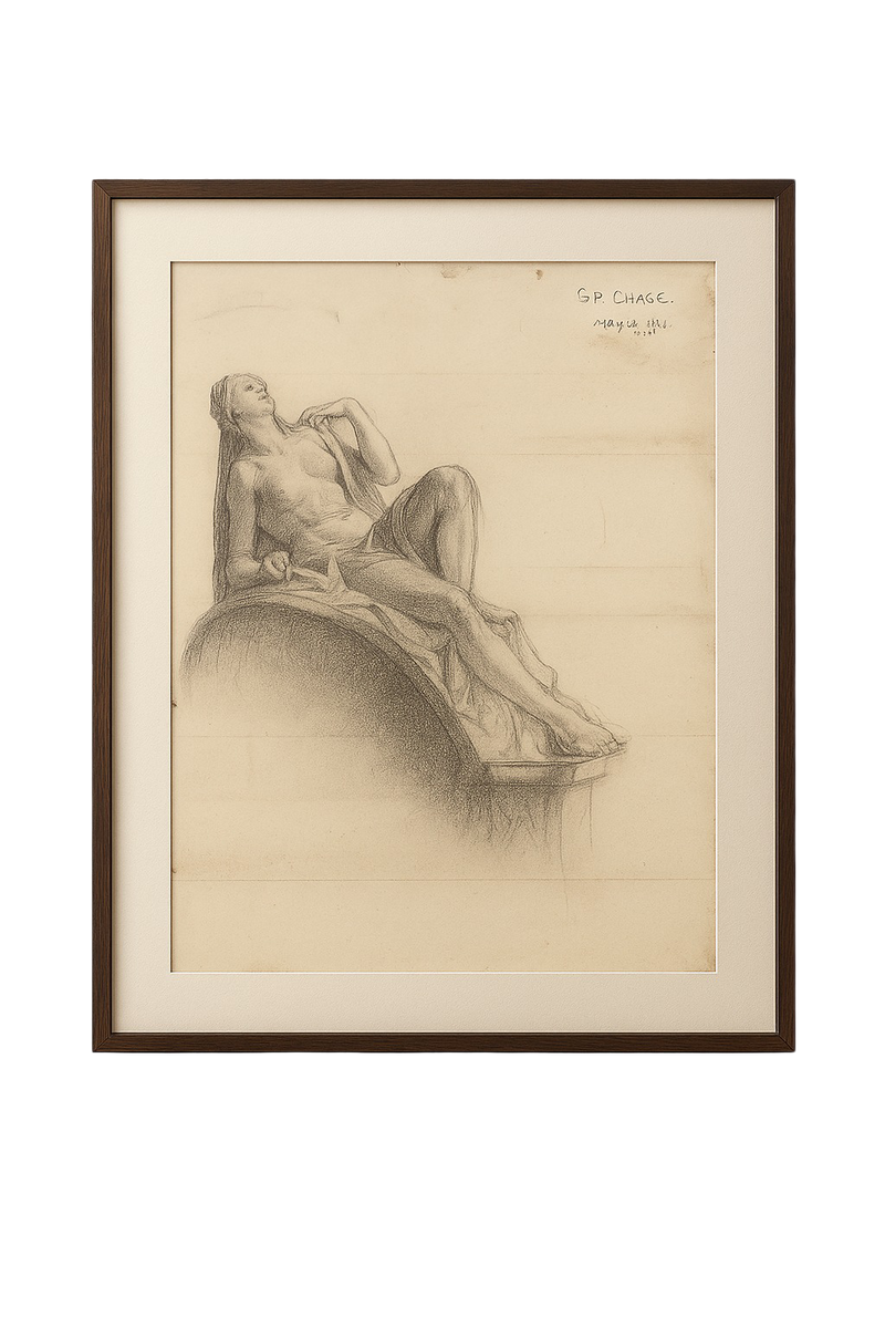 Drawn in the height of the academic tradition, this striking composition depicts a nude female figure reclining atop an architectural arch. With bold chiaroscuro and classical restraint, the artist captures both the anatomical clarity of the form and the subtle theatricality of its setting.